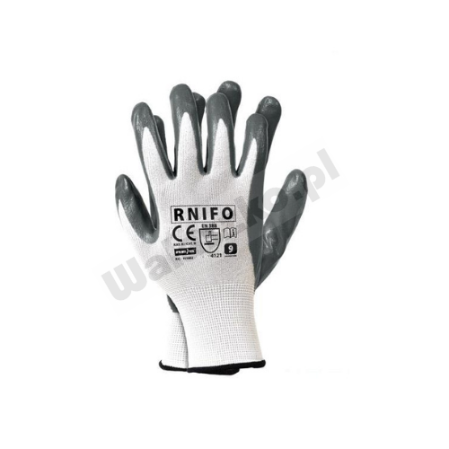 Rękawice ochronne wykonane z nylonu, powlekane chemicznie spienianym nitrylem typu FOAM w kolorze szarym.