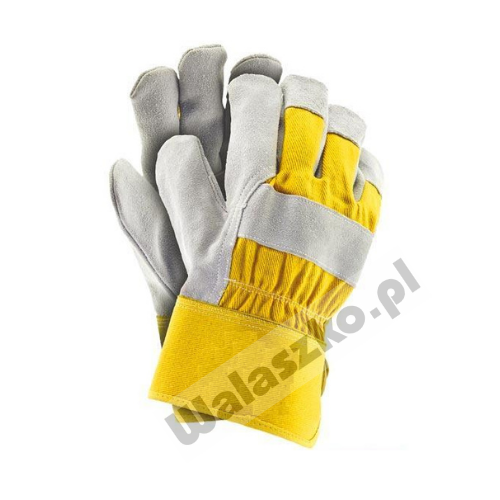 Rękawice robocze skórzane z dwoiny. Część chwytna wykonana z jednego kawałka skóry.