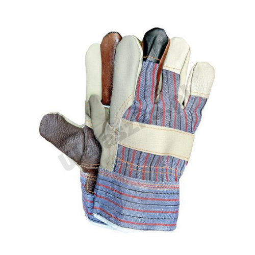 Rękawice drelichowe wzmacniane różnokolorową skórą licową, bydlęcą.